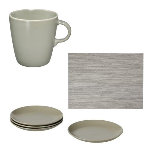 IKEA Dining Set: 4-Pack FÄRGKLAR Matt Green Plates & Mugs with SNOBBIG Light Grey Placemats