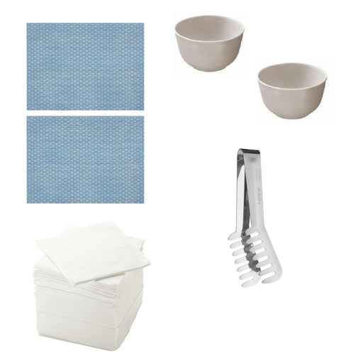 Ikea Kitchen Essentials Set, White Ceramic Bowls (2 Pack), Blue Placemats (2 Pack), White Napkins (100 Pack), Stainless Steel Tongs (1 piece)