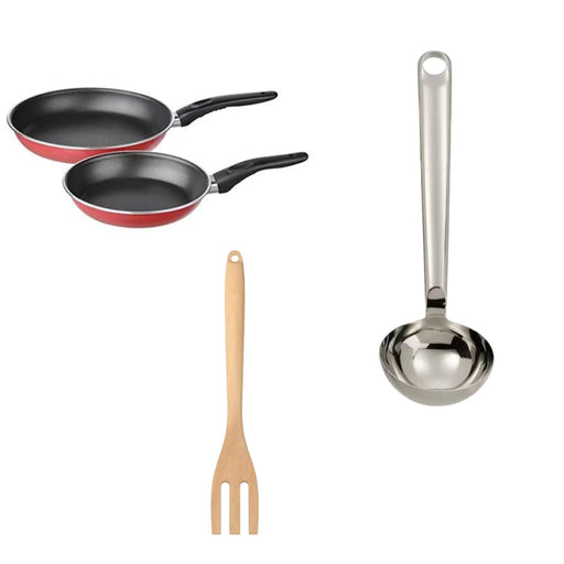 IKEA RÖRT Fork, beech with FINMAT Soup ladle, stainless steel, 31 cm and KAVALKAD Frying pan, set of 2, red,