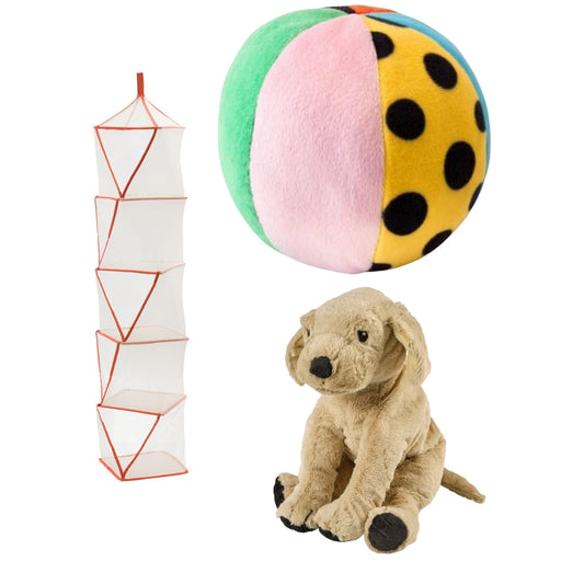 View full detailsIKEA TIGERFINK Storage with 5 compartments, beige/orange with KLAPPA Soft toy, ball, multicolor and GOSIG GOLDEN Soft Toy Dog - Golden Retriever