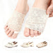 These beige toeless half socks combine comfort and elegance for women who love heels and sandals. The cushioned forefoot pad reduces pressure while the lace fabric adds a stylish touch. Designed to stay hidden inside shoes, they offer breathable support with toe loops for secure wear.