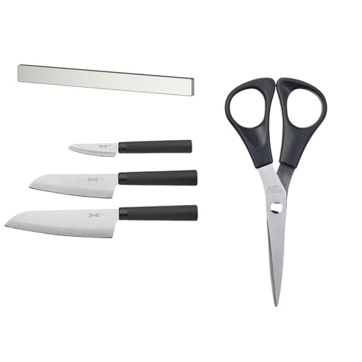 View full detailsIKEA Kungsfors/MÅNÖGA /FÖRSLAG Magnetic knife rack, stainless steel, 56 cm withScissors, stainless steel/black and 3-piece knife set