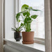 Place the brown pot on a woven rattan tray or macramé mat. The natural textures enhance the boho vibe while protecting surfaces.