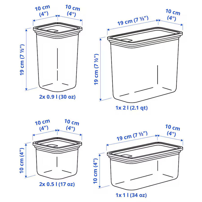 - Comprises: 2 jars with lids (0.5 l, 10x10x10 cm), 2 jars with lids (0.9 l, 10x10x19 cm), 1 jar with lid (1 l, 19x10x10 cm), and 1 jar with lid (2 l, 19x10x19 cm).